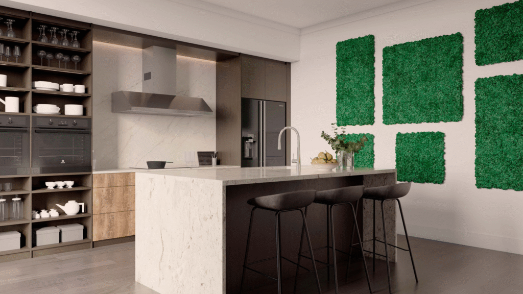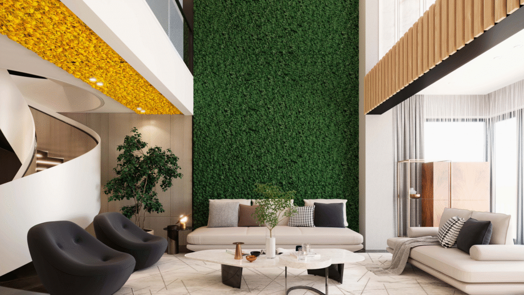 La combinación de paneles fonoabsorbentes y revestimientos con musgo natural permite lograr espacios acústicamente eficientes, sostenibles y visualmente atractivos. Esta solución integra diseño, confort y funcionalidad, aportando un carácter distintivo a cualquier proyecto de interiorismo contemporáneo.